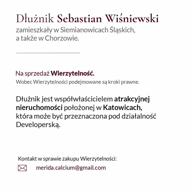 Szanowni Państwo, na sprzedaż Trzy wierzytelności - CESJA WIERZYTELNOŚCI - Dłużnicy są w posiadaniu , jako ...