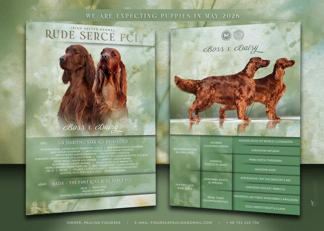 W naszej hodowli Rude Serce FCI planujemy miot na maj 2026 r. Ojcem miotu zostanie Boss - Sire Shooting Star All Irish Gold: ...